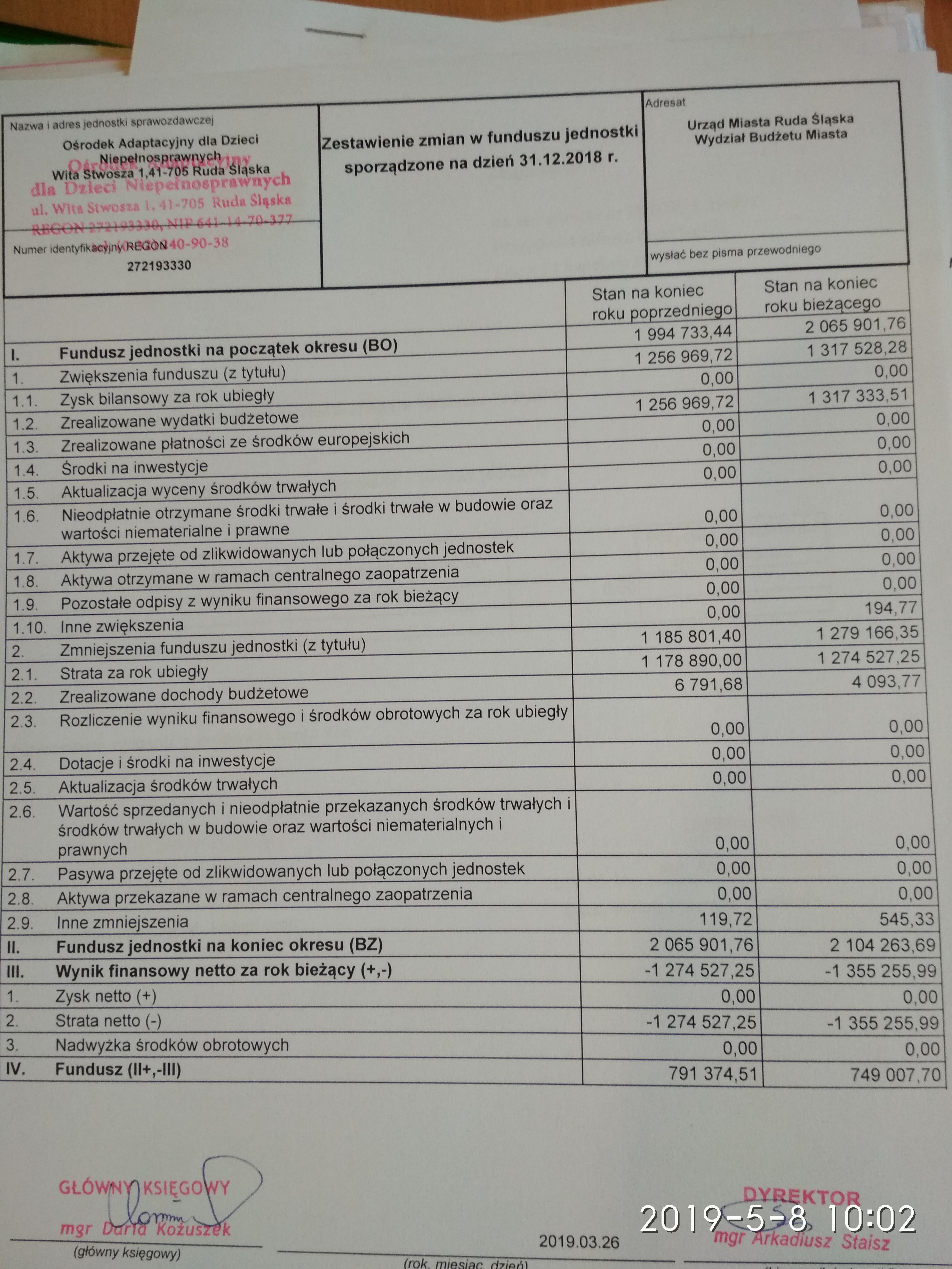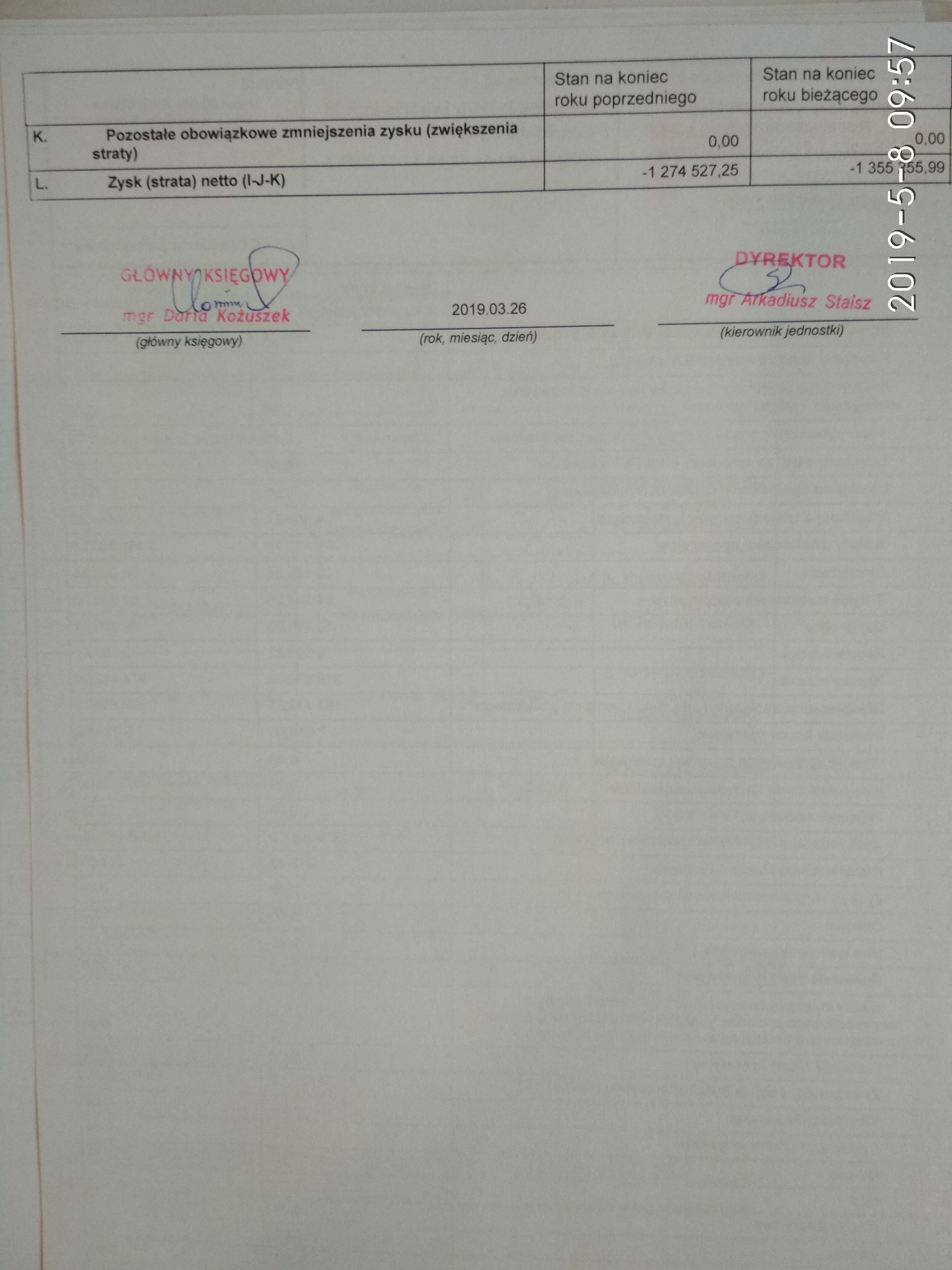 Sprawozdanie finansowe za 2018 r.Utworzono: środa, 08 maj 2019 17:36 | Poprawiono: środa, 08 maj 2019 17:40 | Opublikowano: środa, 08 maj 2019 17:36 | Daria Kożuszek | Drukuj | E-mail | Odsłony: 2309 Sprawozdanie finansowe za 2018 rok (...) Załączniki: oadn 1 bilans 2018.jpg[ ]1823 kB2019-05-08 17:36 oadn 2 RZiS 2018 s.1.jpg[ ]1890 kB2019-05-08 17:36 oadn 3 RZiS 2018 s.2.jpg[ ]1201 kB2019-05-08 17:36 oadn 4 Zest.zmian w fund.2018.jpg[ ]1780 kB2019-05-08 17:37 oadn 5 Inf.Dod.2018 s.1.jpg[ ]1864 kB2019-05-08 17:37 oadn 6 Inf.Dod.2018 s.2.jpg[ ]1418 kB2019-05-08 17:37 oadn 7 Inf.Dod.2018 s.3.jpg[ ]1507 kB2019-05-08 17:37 oadn 8 Inf.Dod.2018 Korekta.wyjaśnienie.jpg[ ]1277 kB2019-05-08 17:39 oadn 9 Inf.Dod.2018 Korekta.s.1.jpg[ ]1434 kB2019-05-08 17:39 oadn 10 Inf.Dod.2018 Korekta.s.2.jpg[ ]1649 kB2019-05-08 17:39 oadn 11 Inf.Dod.2018 Korekta.s.3.jpg[ ]1822 kB2019-05-08 17:40 oadn 12 Inf.Dod.2018 Korekta.s.4.jpg[ ]1372 kB2019-05-08 17:40